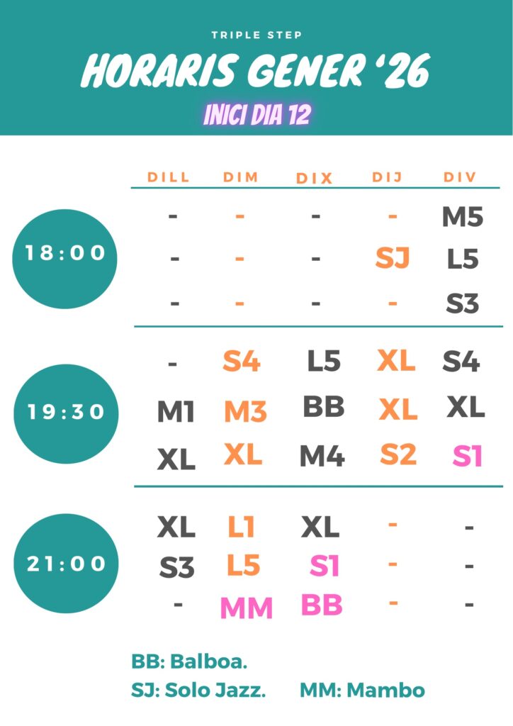 En la imatge d’aquí al costat pots veure la nostra disponibilitat de cursos, si comences a ballar fixa’t en els cursos S1 i recorda que cada 7 setmanes oferim nous cursos per començar i segur que podràs trobar el que millor t’encaixi.