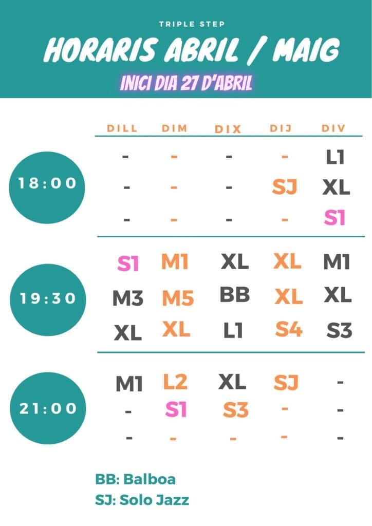En la imatge d’aquí al costat pots veure la nostra disponibilitat de cursos, si comences a ballar fixa’t en els cursos S1 i recorda que cada 7 setmanes oferim nous cursos per començar i segur que podràs trobar el que millor t’encaixi.
