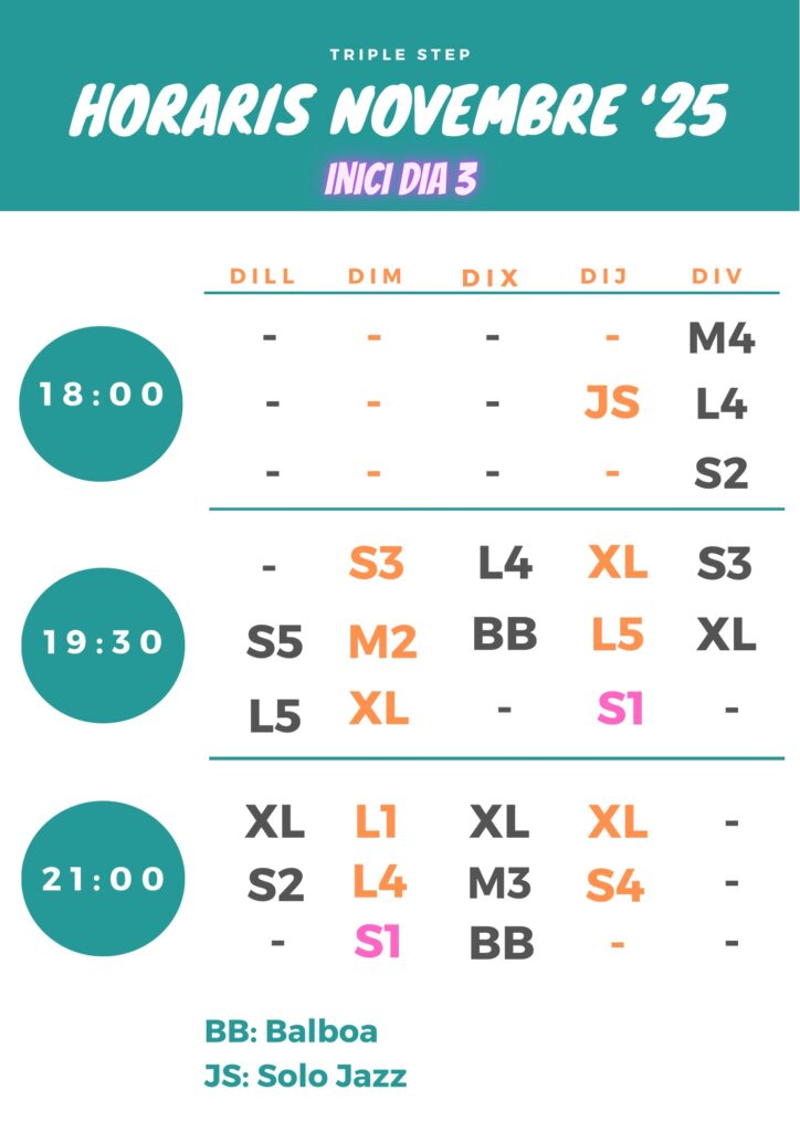 En la imatge d’aquí al costat pots veure la nostra disponibilitat de cursos, si comences a ballar fixa’t en els cursos S1 i recorda que cada 7 setmanes oferim nous cursos per començar i segur que podràs trobar el que millor t’encaixi.